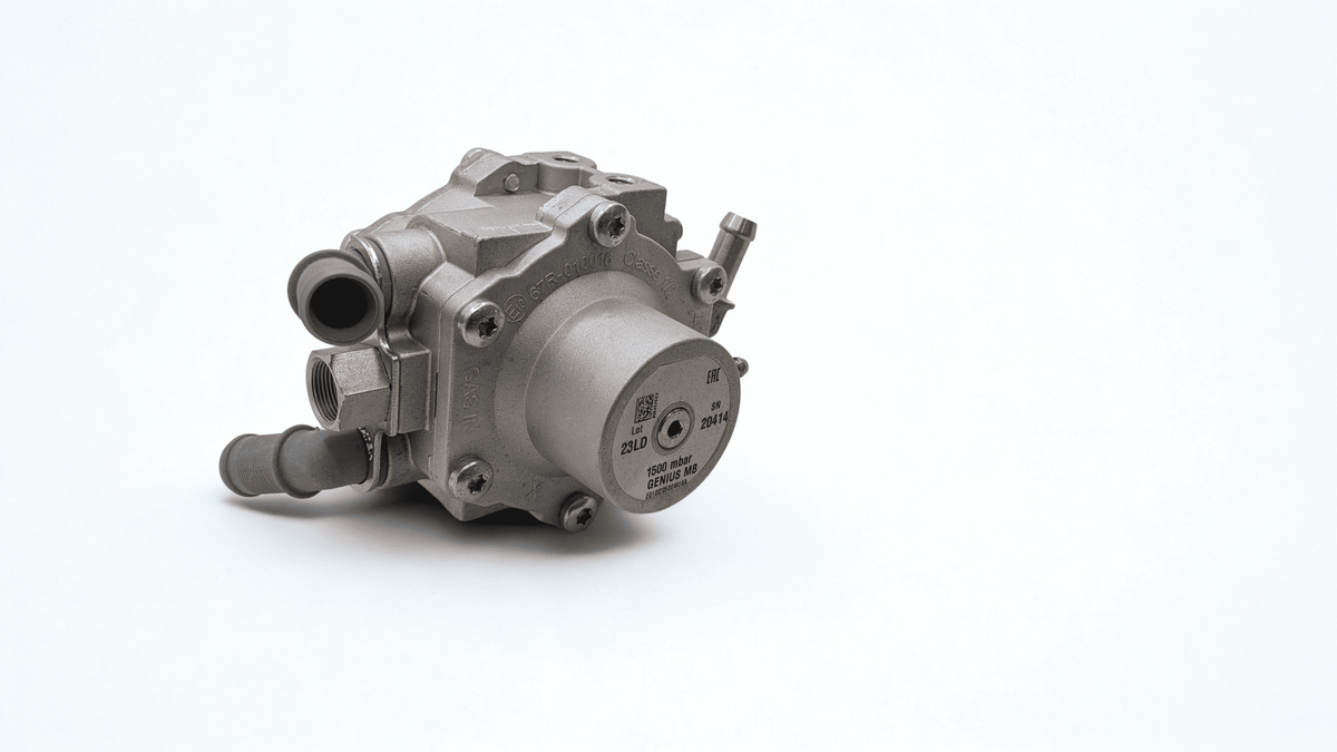 Soporta motores de hasta 190 HP (140 kW). Presión de trabajo nominal de 1500 mbar (1,5 bar), ajustable entre 0,9 y 1,7 bar. Conexiones: entrada gas 8 mm, salida gas 12 mm, agua 16 mm y toma vacío 5 mm.
