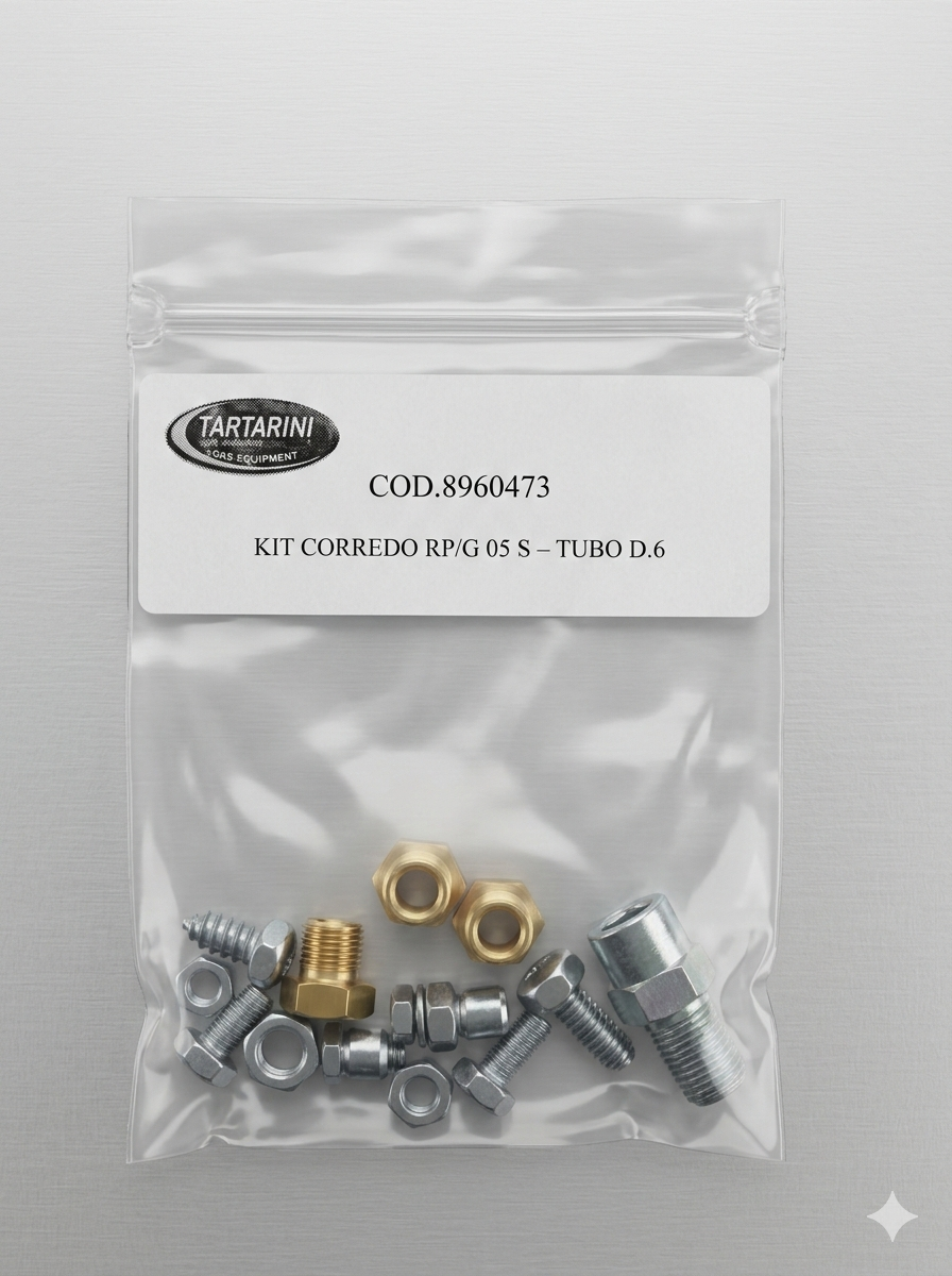 El Kit Corredo Tartarini COD.8960473 es el conjunto oficial de herrajes y componentes de fijación necesarios para la correcta instalación y mantenimiento de los reductores de la serie RP/G 05 S. Este kit está específicamente dimensionado para trabajar con tubería de Ø6mm (termoplástica o cobre), asegurando una estanqueidad absoluta en las líneas de alta presión del sistema GLP.