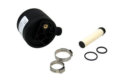 Contiene filtro de fase gaseosa (baja presión) con salida de 12 mm y entrada de 16 mm, fabricado en plástico o metal con cartucho de poliéster de alta eficiencia. También incluye filtro de fase líquida (alta presión) específico para eVP-500 Tipo 1 (referencia 181/140001), además de juntas tóricas y abrazaderas para montaje.